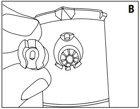 Insert the desired nozzle into the nozzle socket and turn the radius adjustment screw clockwise to secure the nozzle in place. (B)