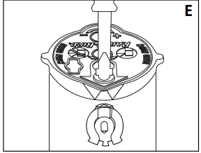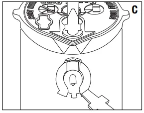 Insert the identification plug of the selected nozzle into the opening on the top of the rotor. To remove the nozzle, back out the radius adjustment screw. Place the blade of a screwdriver under the nozzle removal tab and press the handle down. (C)